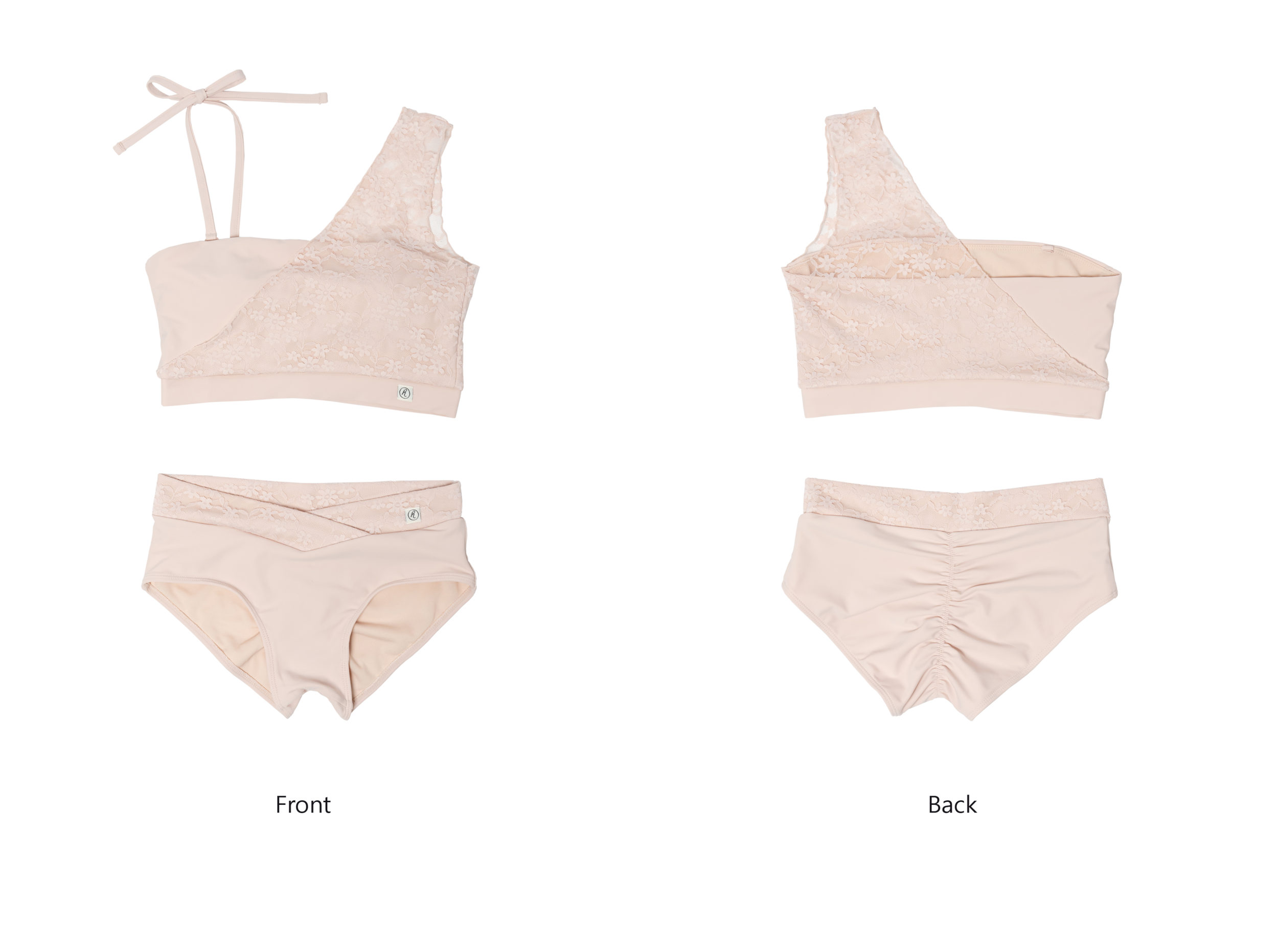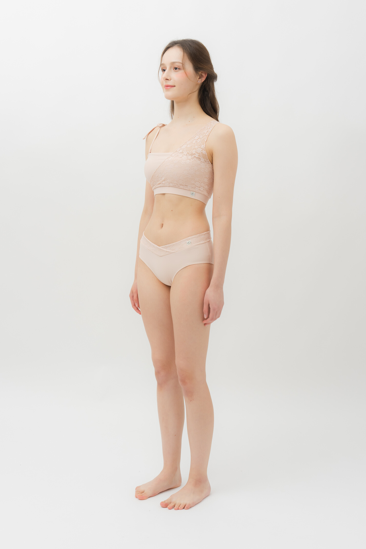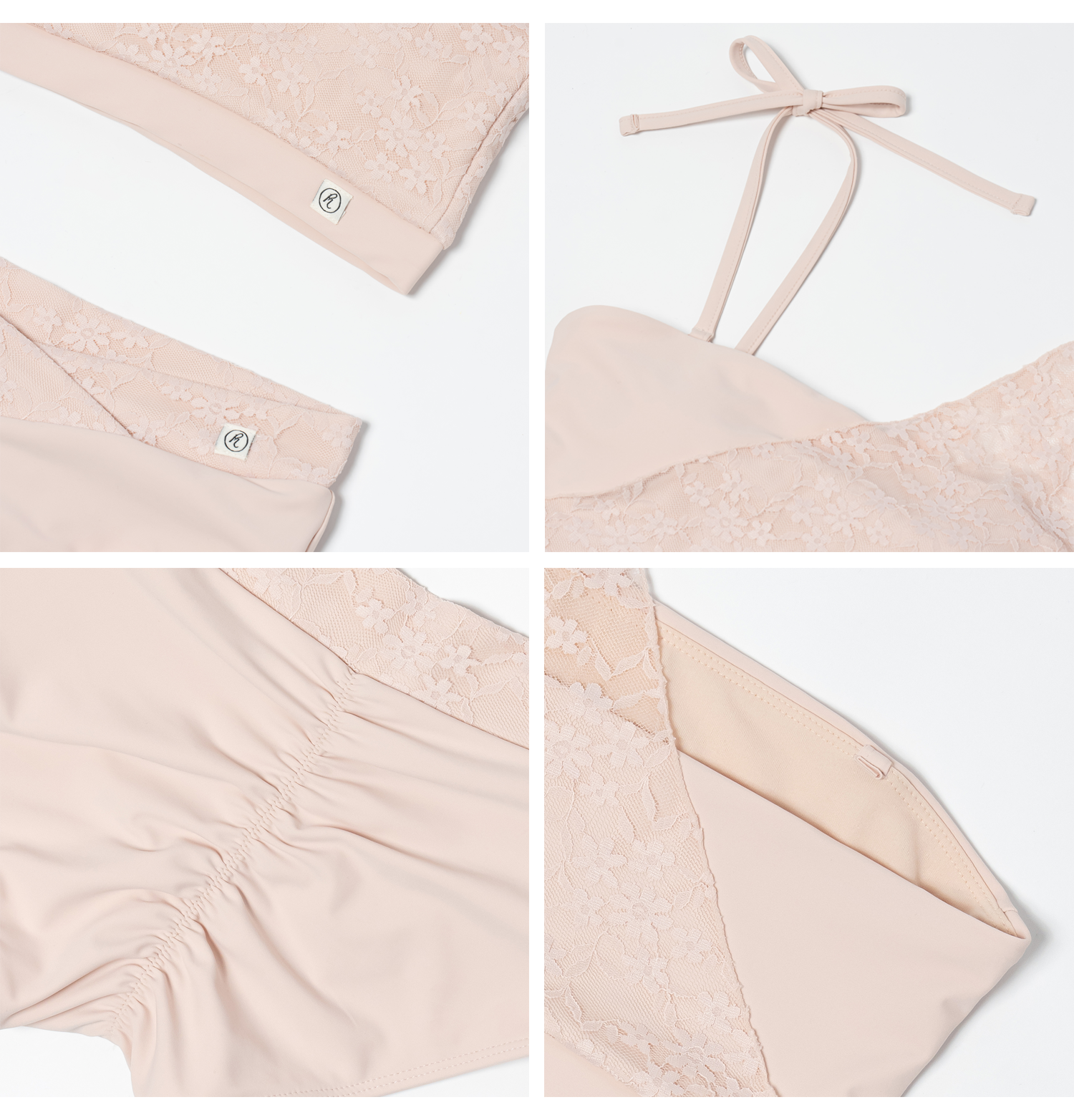 앞면에서부터 뒷면까지 이어져있는 원숄더 레이스로 여성스러운 느낌을 주고 리본으로 연출가능한 어깨끈이 포인트가 되는 디자인입니다.