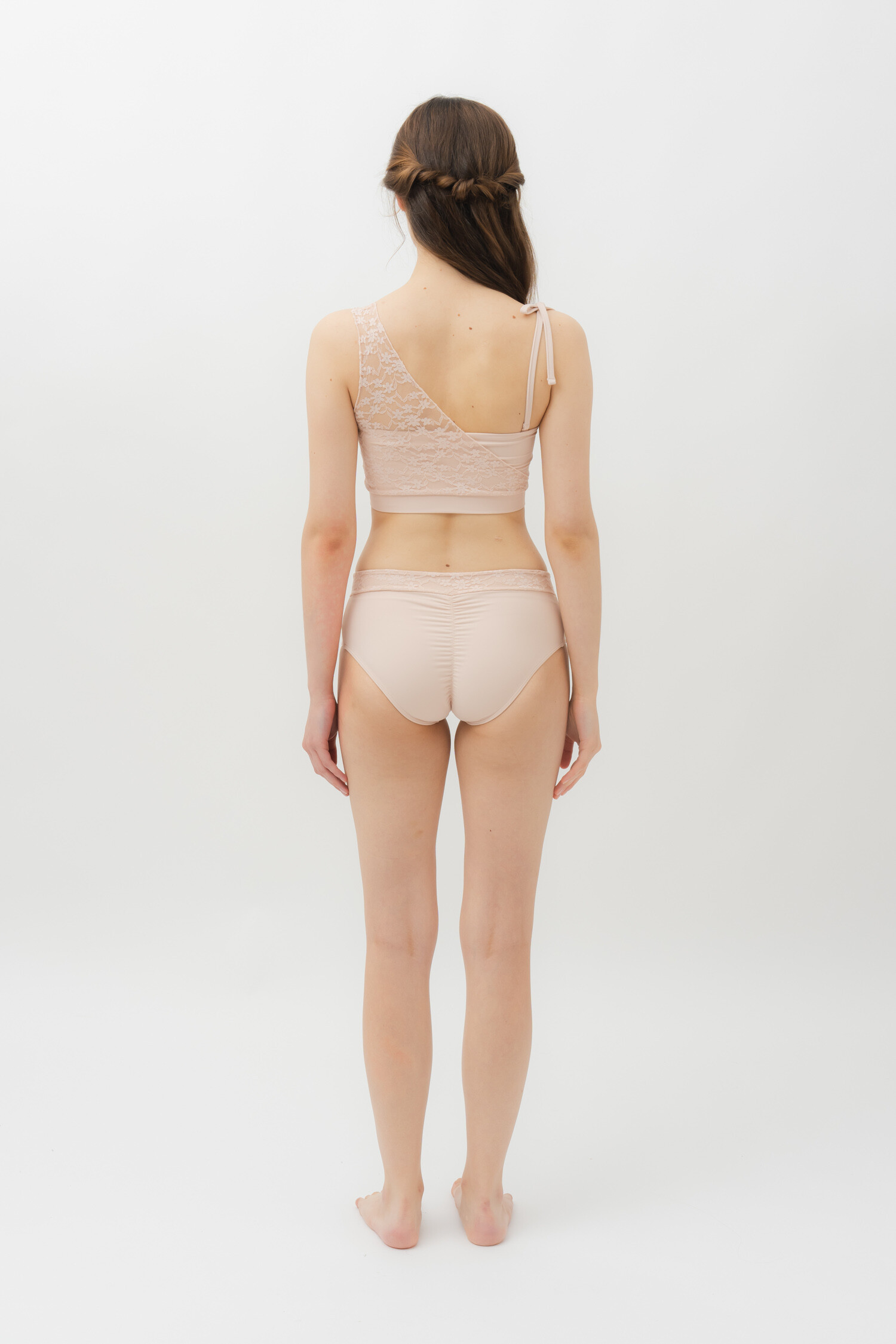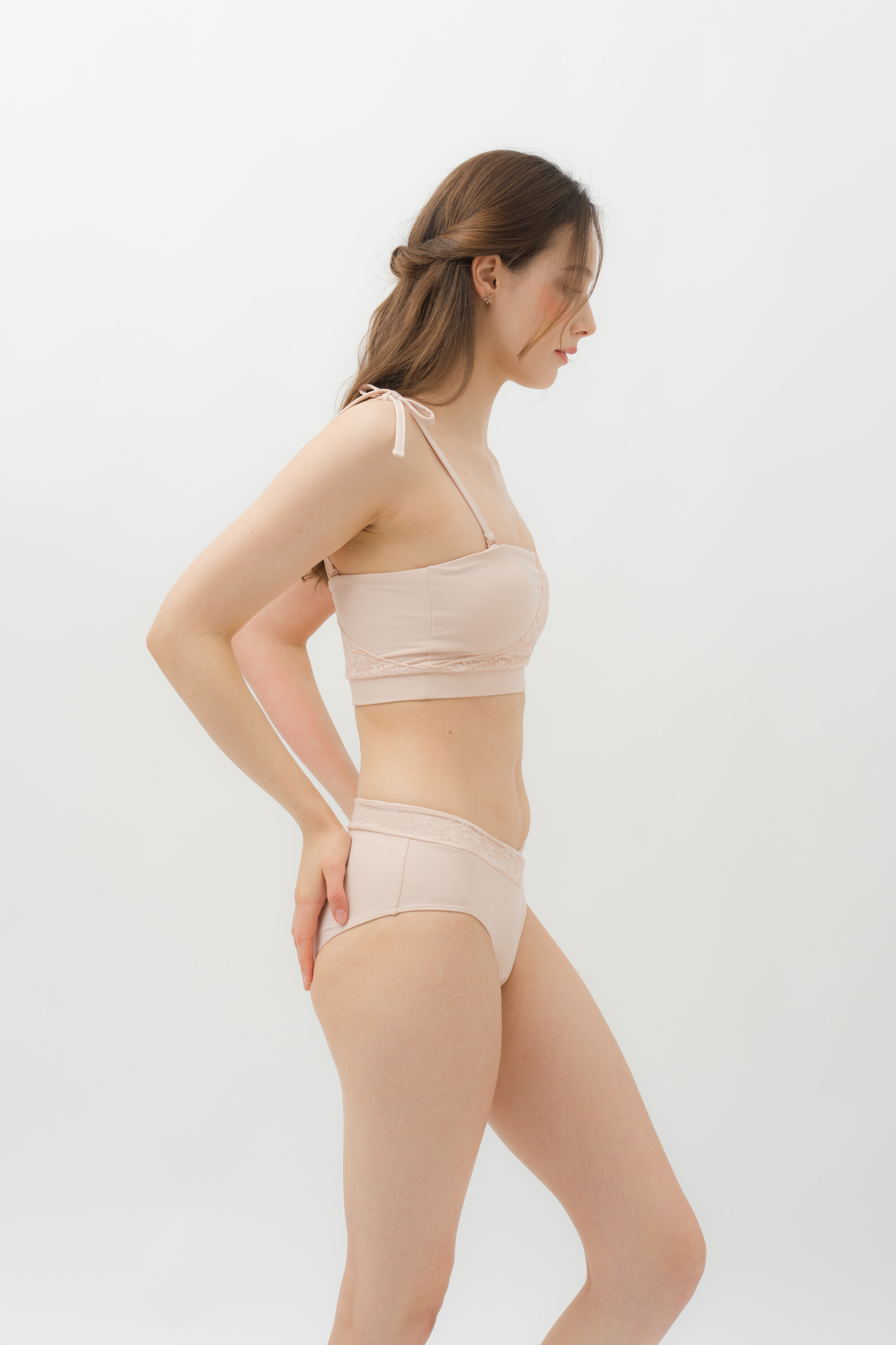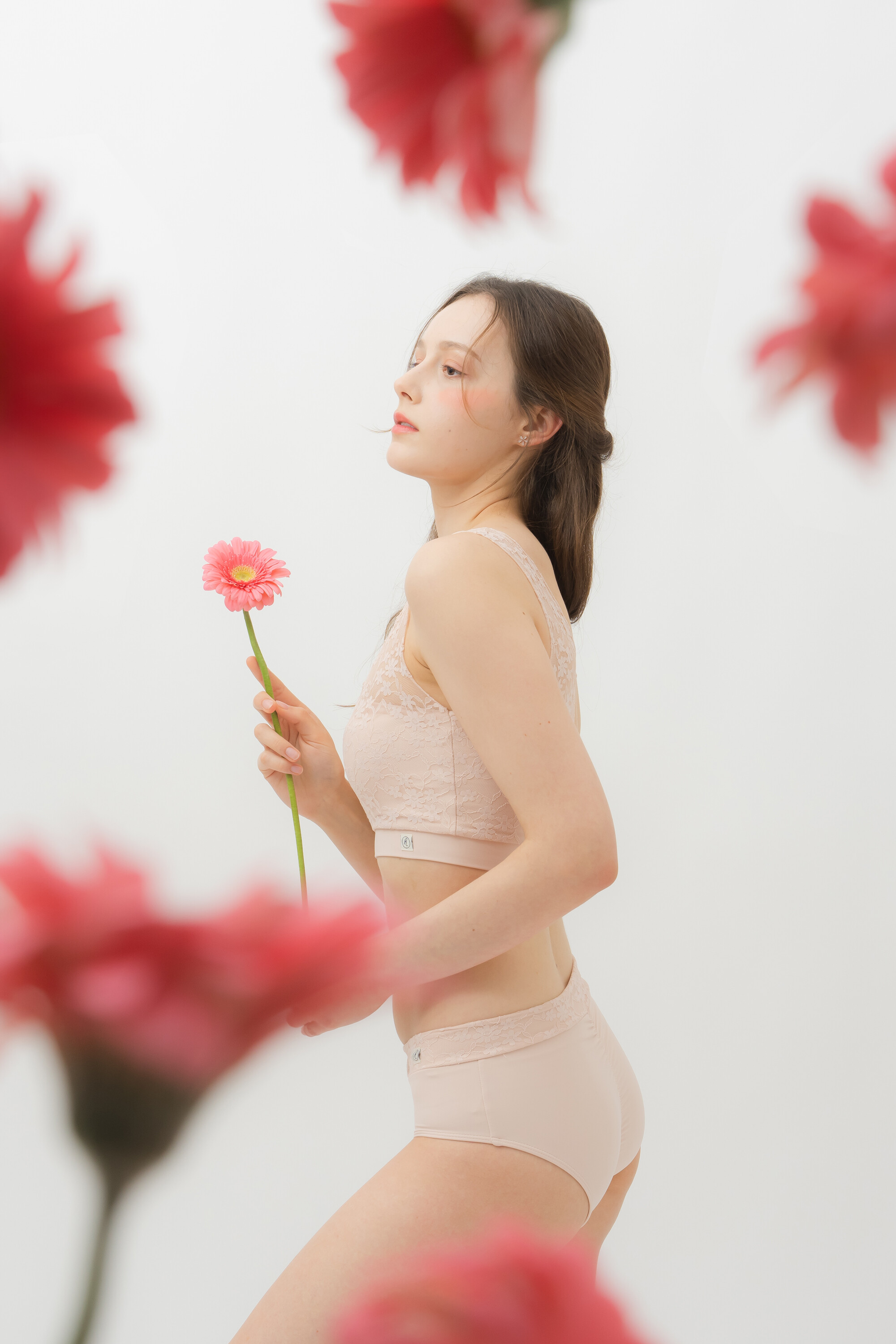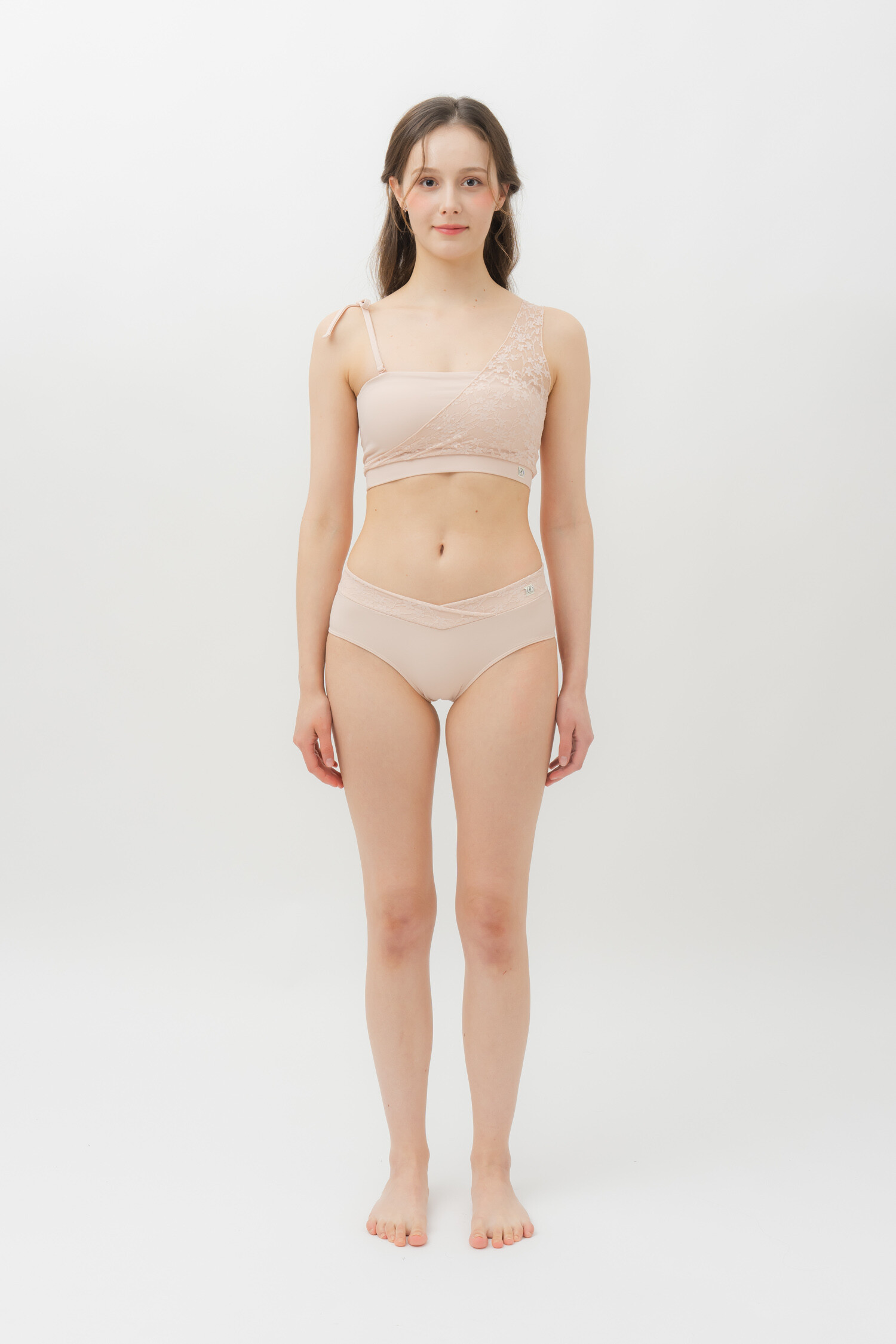 앞면에서부터 뒷면까지 이어져있는 원숄더 레이스로 여성스러운 느낌을 주고 리본으로 연출가능한 어깨끈이 포인트가 되는 디자인입니다.